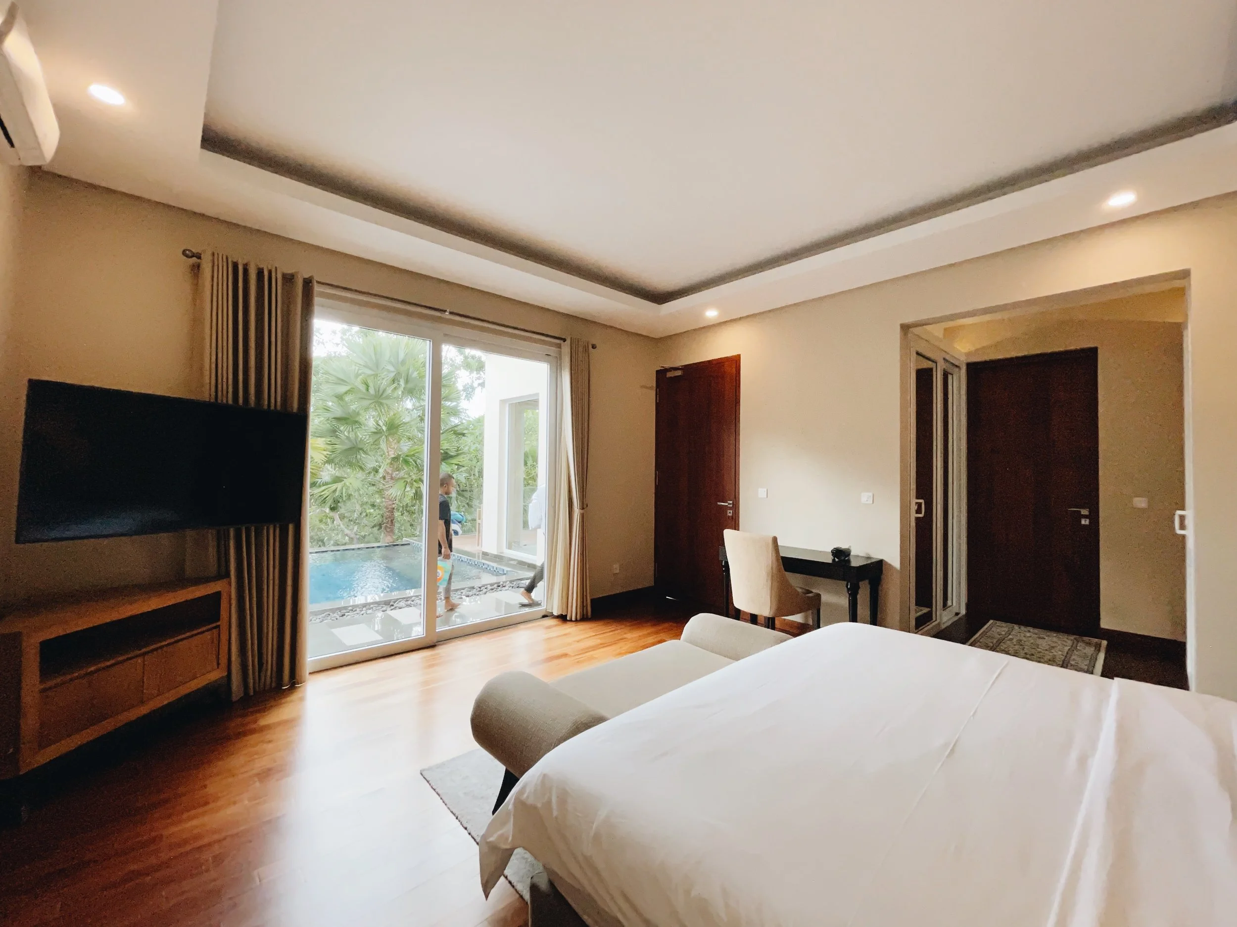 Experience indulgence in our lavish 262-square-meter villa, boasting a fully equipped kitchen, two spacious bedrooms with luxurious ensuite bathrooms, with one featuring bathtub. This two-story haven features exquisite Javanese wooden floors, complemented by modern amenities such as smart TVs and full air conditioning in every room. Bask in the allure of your private pool, embracing the perfect blend of opulence and comfort within your exclusive retreat. This villa offers street views and panoramic vistas of treetops and hills, providing the ideal haven for your Bali escape.
